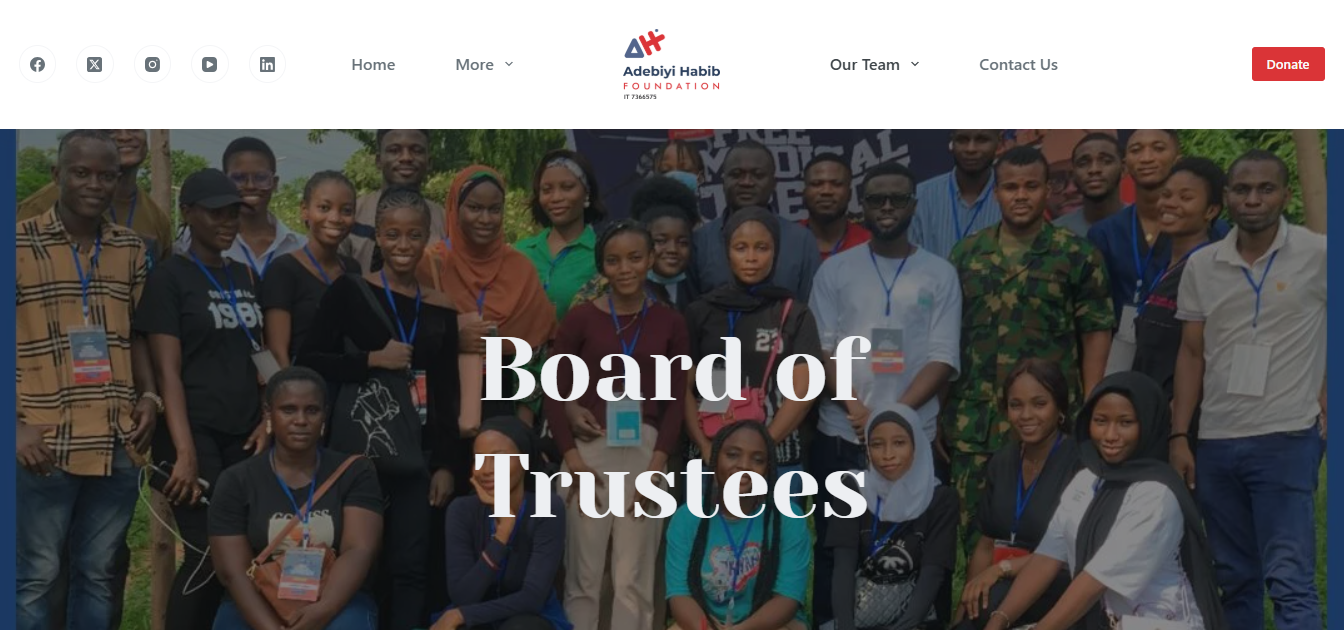 The Adebiyi Habib Foundation required a digital platform that could clearly communicate its mission of empowering underserved communities while showcasing the breadth of its social impact initiatives. The challenge was to design a website that effectively represents a multi-focus nonprofit organization working across education, healthcare, youth development, and community empowerment. The platform needed to inspire trust, encourage participation, and present the Foundation as a credible vehicle for sustainable development, while remaining simple and accessible to a wide audience including beneficiaries, partners, and supporters.