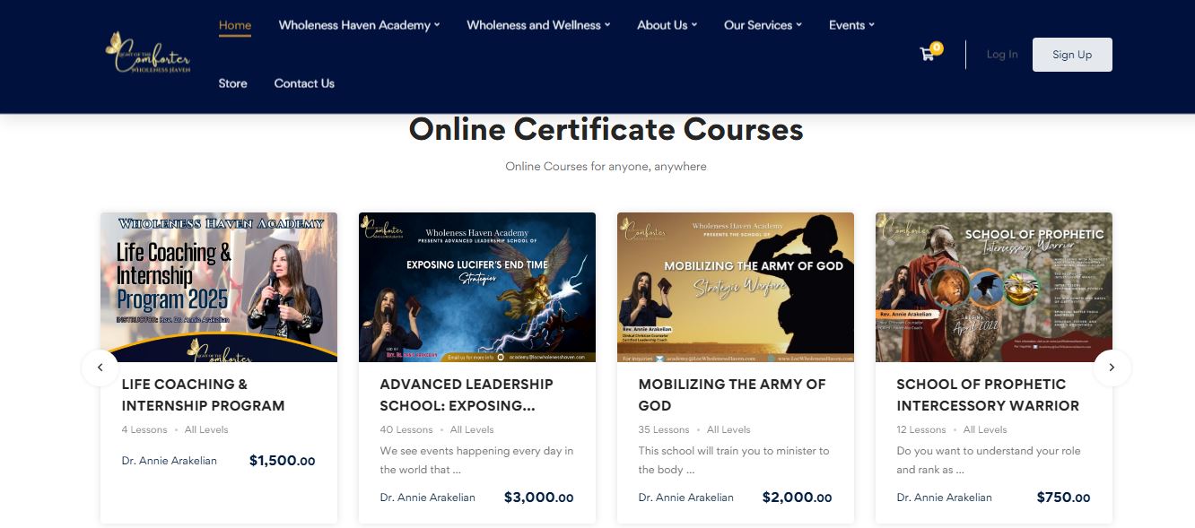 Light of the Comforter Wholeness Haven, a transformational healing ministry led by Rev. Annie Arakelian, needed a comprehensive digital platform to extend their spiritual education and healing services beyond physical boundaries. The challenge was to create a website that could effectively deliver deep spiritual training programs, facilitate online learning for students worldwide, and maintain the intimate, personal connection essential to spiritual growth and healing. The platform needed to serve both individual seekers and ministry leaders while preserving the authenticity and power of in-person spiritual instruction.