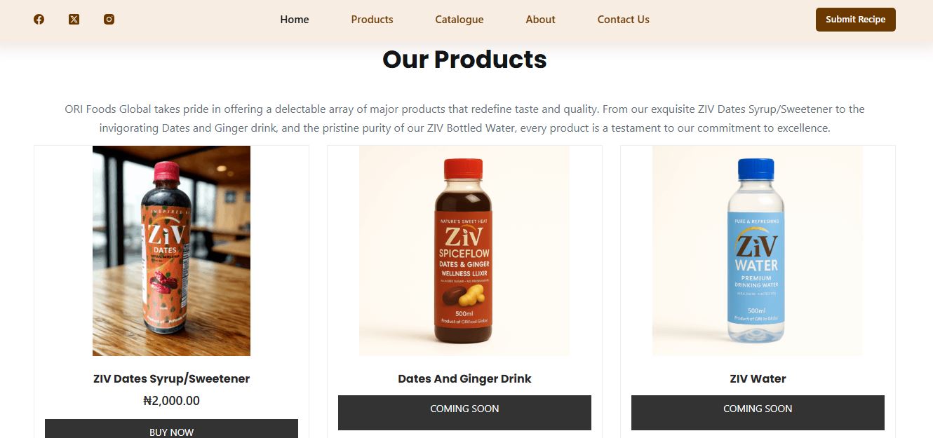 For ORI Foods Global, we developed a sophisticated food manufacturing and distribution platform that showcases their exceptional commitment to organic excellence and community health. The website prominently features their impressive product portfolio of 114 items across four major categories, highlighting signature products like ZIV Dates Syrup/Sweetener, invigorating Dates and Ginger drinks, and pristine ZIV Bottled Water. The platform emphasizes their rigorous sourcing standards, explaining how they “painstakingly select the finest organic farms, fisheries, and producers” to ensure unparalleled quality. Advanced features include detailed product categorization systems, organic sourcing transparency (90% organic commitment), comprehensive company registration credentials establishing trust, and newsletter integration for ongoing customer relationship building. The website effectively communicates their dual market approach, serving both local Nigerian consumers and global markets with packaged foods, beverages, meat, and seafood products.