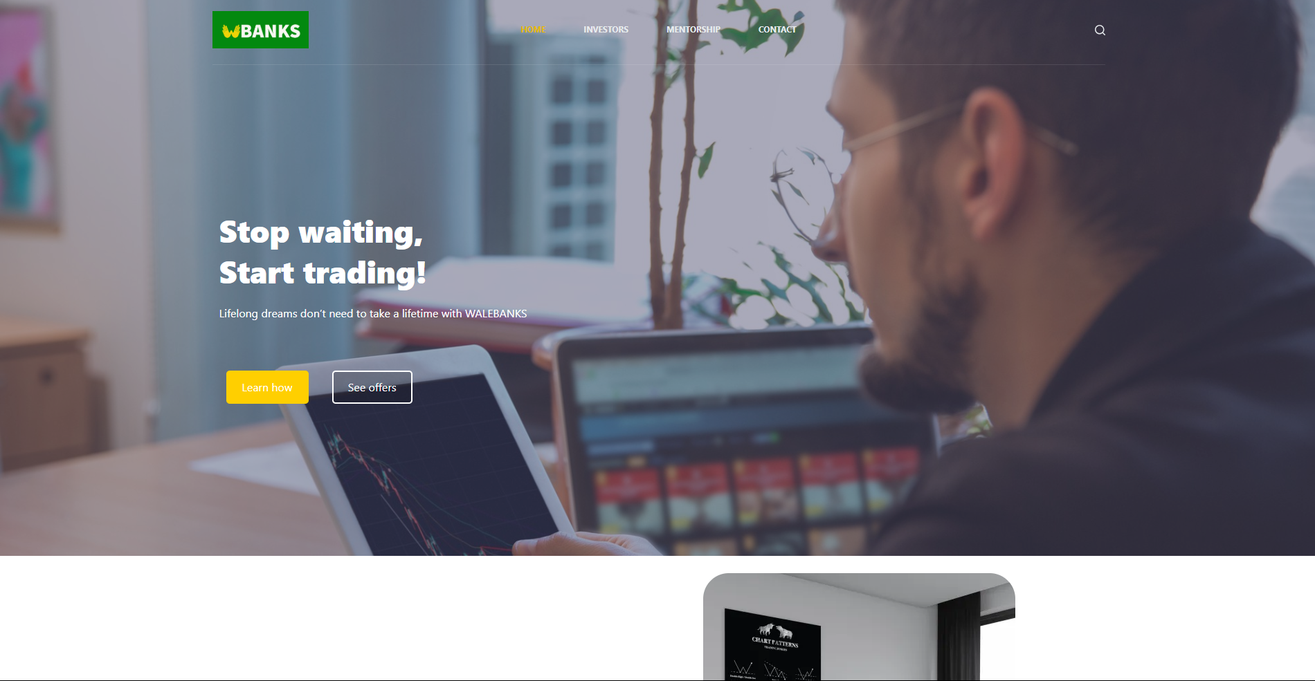 Wales Banks, a trading agency and academy, required a professional online platform to manage its dual focus: offering portfolio management services and mentoring new and intermediate traders in stocks, investments, and forex. The challenge was to create a website that seamlessly integrates educational resources with their portfolio management offerings while ensuring an engaging and user-friendly experience. By combining modern design with intuitive navigation, we built a solution that highlights their expertise and connects with their diverse audience.